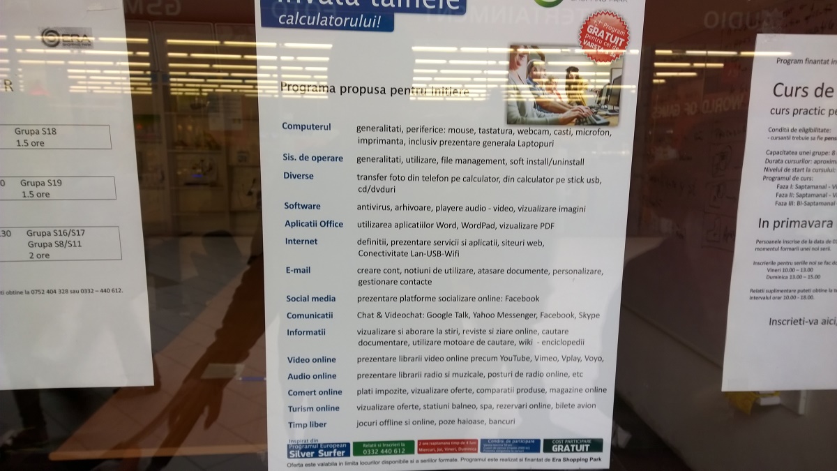 Am fost zilele trecute pe la complexul comercial Era și am vrut să trec și pe la Altex să văd de o tabletă sau un laptop. Vizavi de Altex mi-a sărit în ochi o siglă pe care o poți vedea mai jos: cursuri gratuite pentru calculatoare. Bine, scrie și pe o bulină roșie alături destinate persoanelor în vârstă însă oricum mi se pare amuzantă așezarea pe banner. Oare ce le învață pe calculatoare să facă?