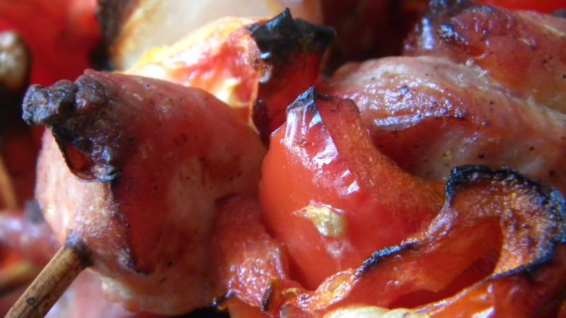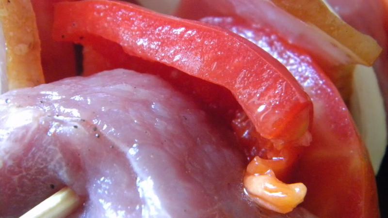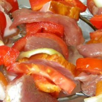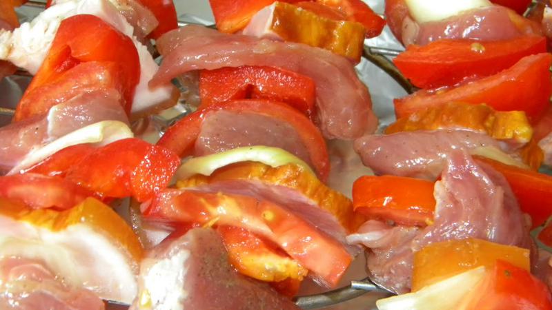 Pe un baț pentru frigărui se infing alternativ o bucată de carne, o felie de ceapă, kaizer, ardei, ceapă.
