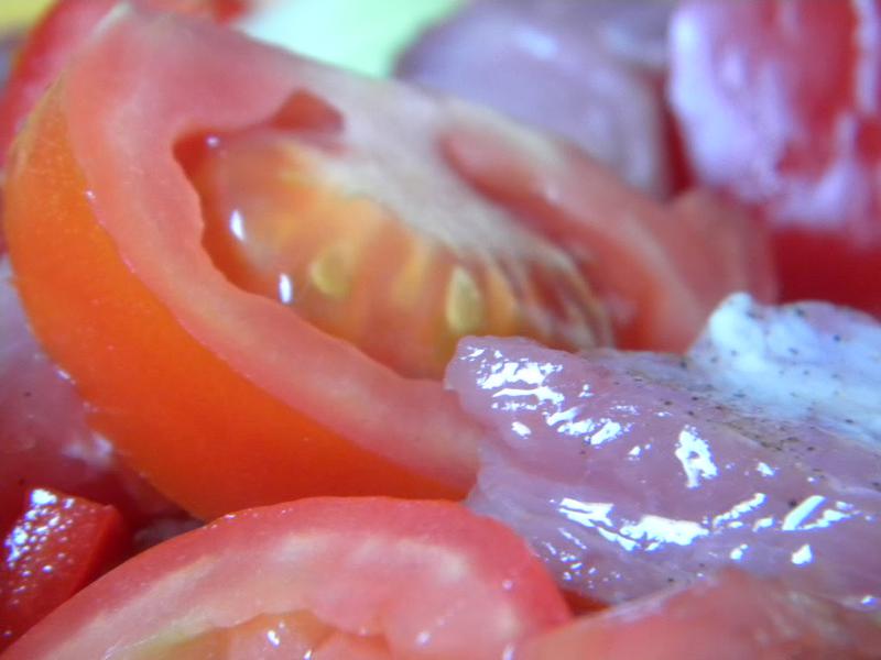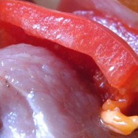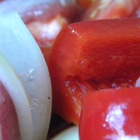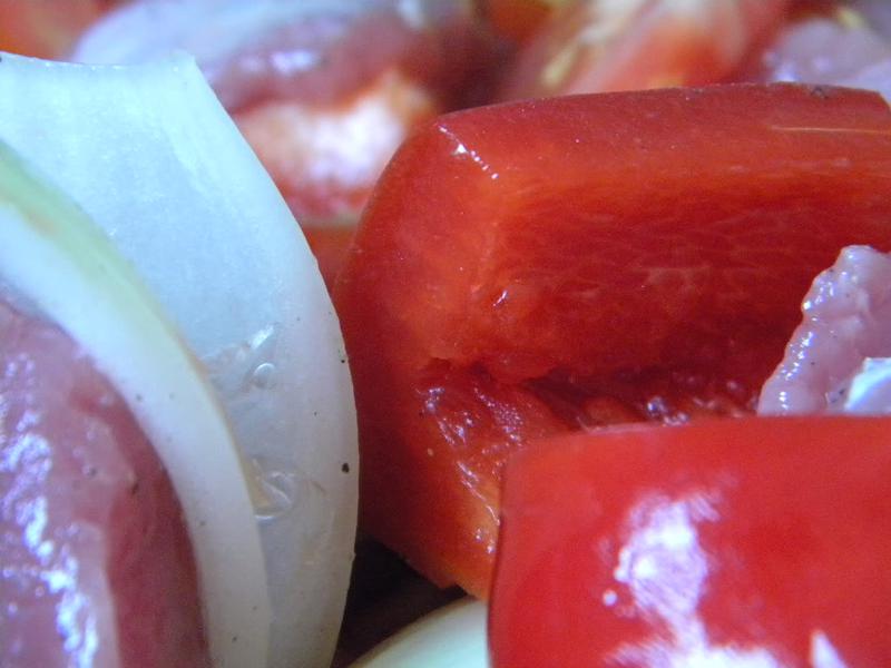 Se taie carnea și ardeiul cuburi, kaizerul, roșiile și ceapa felii.