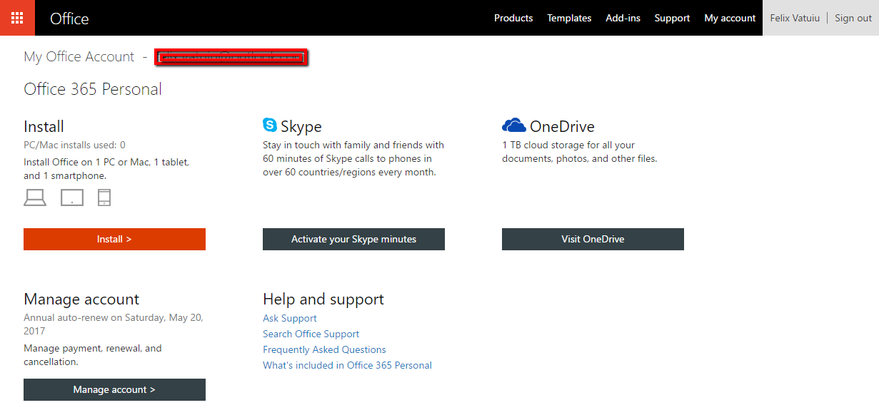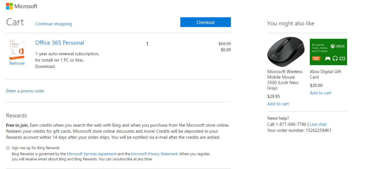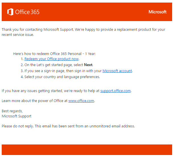 Ce am făcut eu, am dat click pe Live Chat, am vorbit cu o persoană denumită Kobe (sau un bot, cine știe) care după ce s-a convins că eu sunt eu a generat emailul de mai jos. Accesând linkul din mailul ăsta și după câteva câmpuri completate în vreo 2 pagini am căpătat 1TB pe Onedrive, 60 de minute Skype și Office pentru: