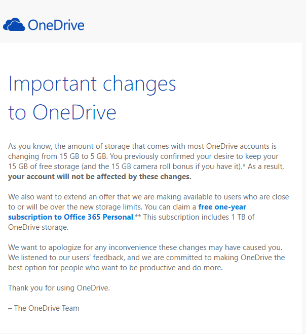 Am primit de la Microsoft mailul de mai jos pentru că am cont de Onedrive și pentru că au o ofertă nouă – Office 365 Personal gratis 1 an.