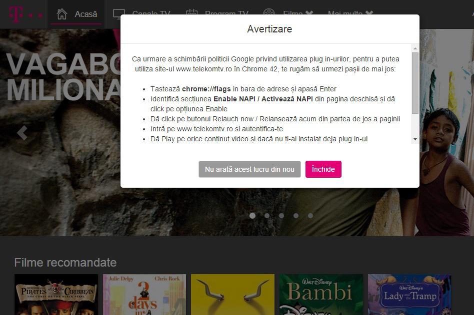 Mesajul ăsta de mai jos îmi cere să aflu ce Chrome folosesc, să intru în niște setări care nu mă interesează, să activez o setare care n-am nici o idee ce înseamnă (poate îmi fură sufletul), să închid și să redeschid browserul și de abia apoi pot să dau niște bani pentru a vedea un film.